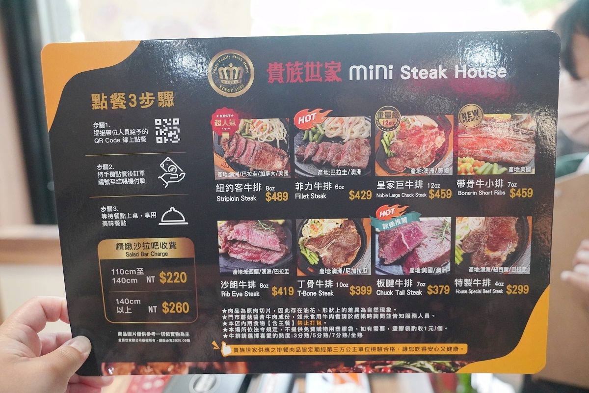 桃園龍潭大池旁全新開幕一間「貴族世家mini龍潭大池店」大家去吃過了沒??貴族世家mini是貴族世家牛排全新打造的輕型平價牛排品牌,特色是餐點多元台味十足、高CP值消費以及智慧點餐結帳系統,這間貴族世家mini龍潭大池店每人299元起即享豐富自助吧吃到飽,像是有現烤披薩、炸物、湯品、冷熱飲、新鮮水果、涼拌菜、滷肉飯、咖哩飯、霜淇淋和燙青菜等,光是自助吧就可以讓人飽到不行,當天我們點了麻辣巨牛排以及最新的「貴族30週年聯名餐」,目前正值「貴族30週年爽爽吃牛排」週年慶活動,即日起至12月20日止,活動期間消費指定聯名排餐即可獲得爽爽吃貨吊飾乙個,活動期間內會員滿指定點數可加價換購聯名贈品,數量有限換完為止唷!