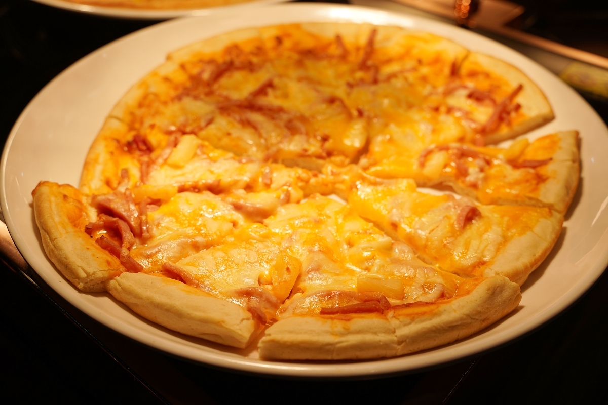 現烤披薩會一直出爐,口味都會不太一樣,口感是薄皮披薩,小孩很愛吃
