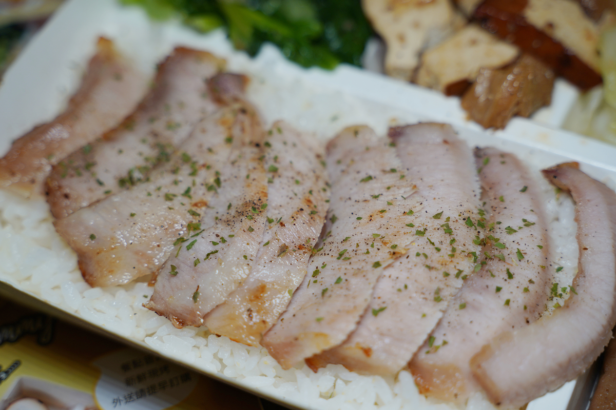 烤食煮盒便當南港店的便當口味選擇多,有烤雞腿、牛肉片、松阪豬、烤鮭魚、板腱牛排、鹹豬肉、烤鯖魚、梅花豬、烤鯛魚和杏鮑菇,每份飯盒都由主菜+白米飯+4份季節配菜+炒菜圃,有提供加飯服務