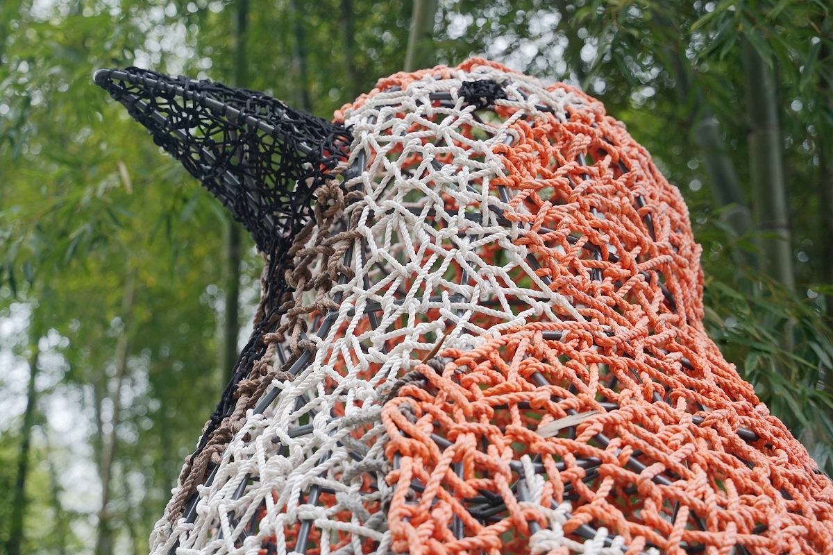以金屬結構、染色棉繩編織與竹片建構而成的「山麻雀」竹構作品,遠看真的有點可愛