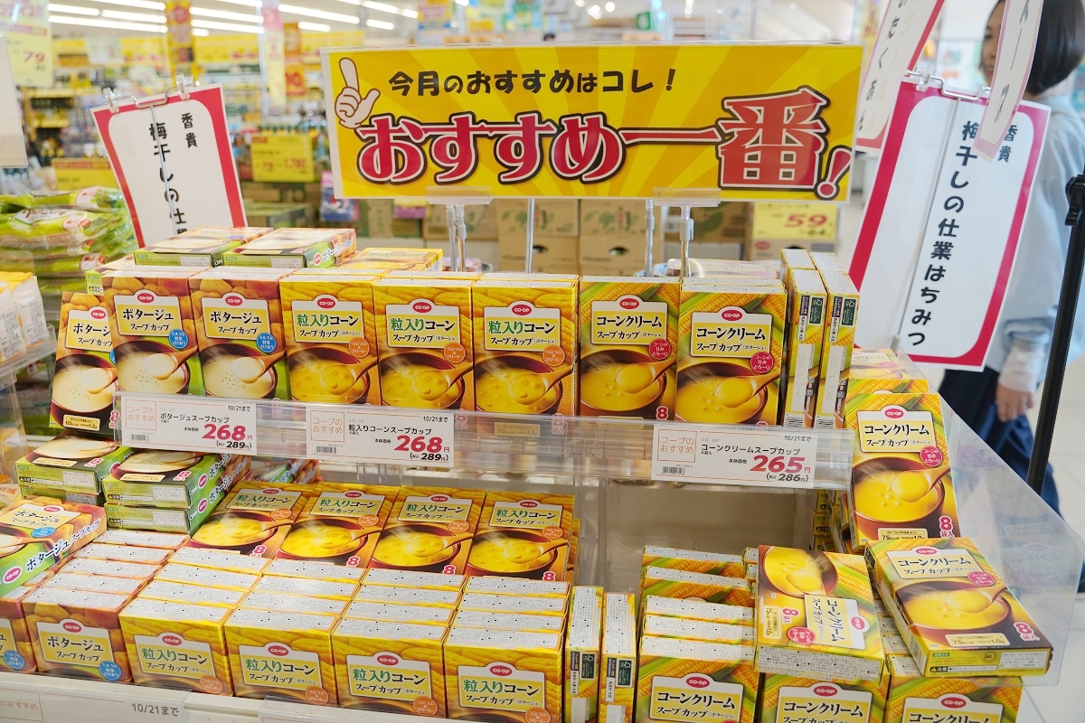 本月推薦商品就擺放在靠近門口處,北海道必買商品之一就是馬鈴薯濃湯與玉米濃湯