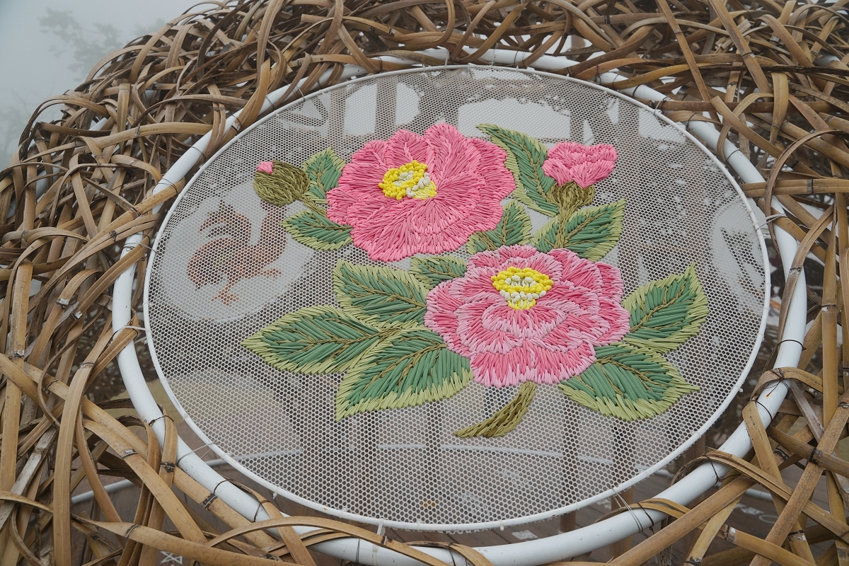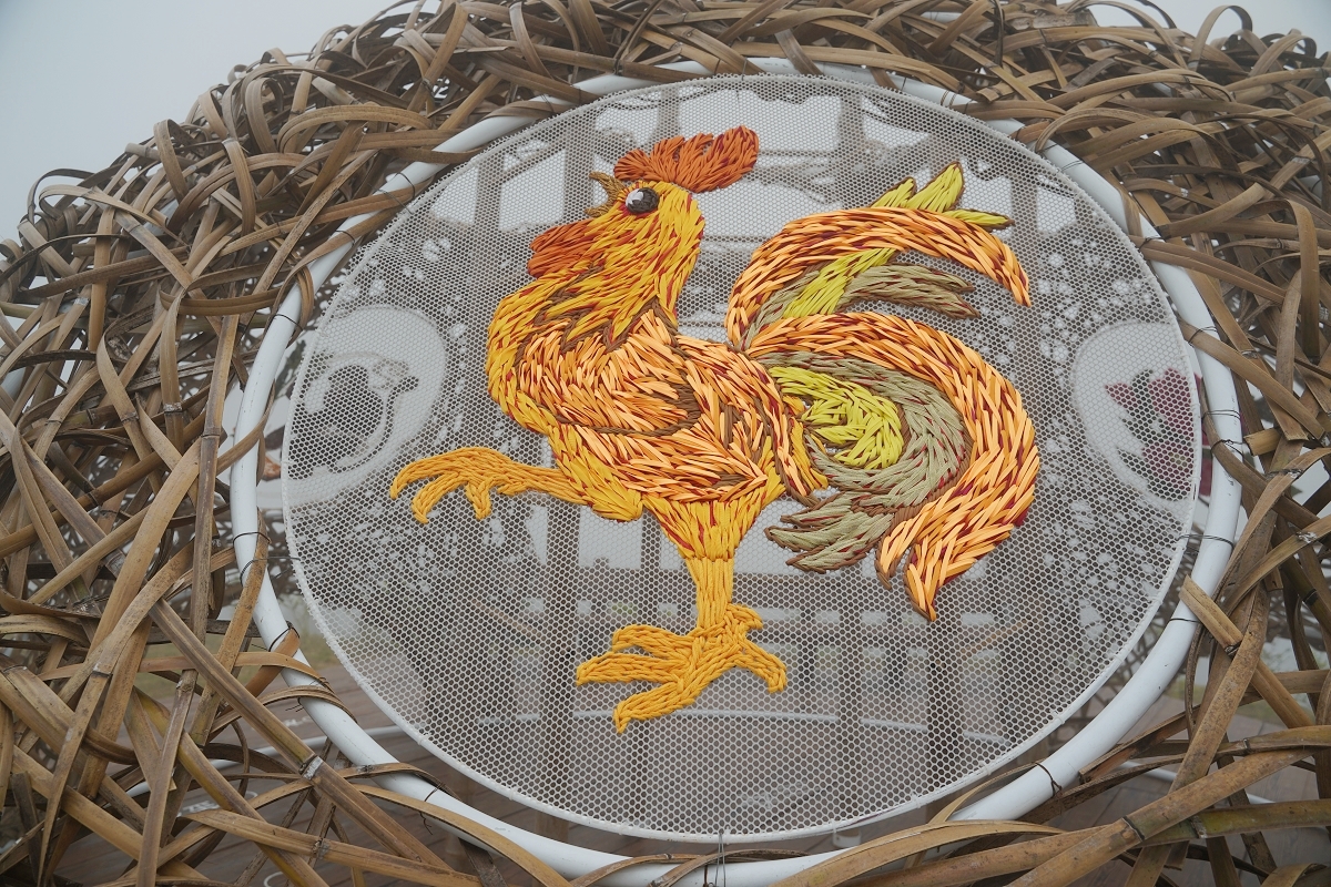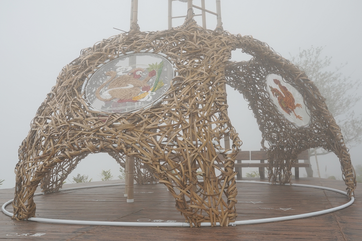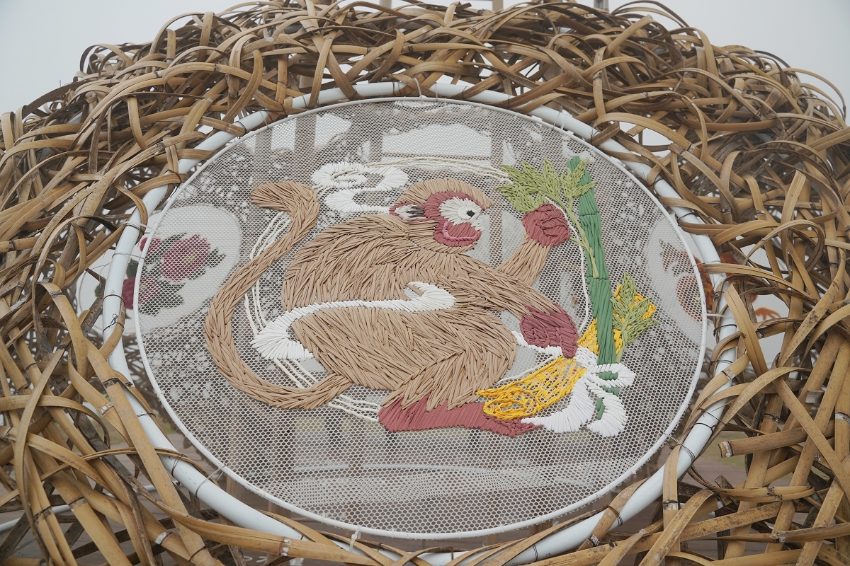 作品下方的鐵構竹編穹頂上會點綴山茶花、夜猿、閹雞等象徵地方文化的圖案