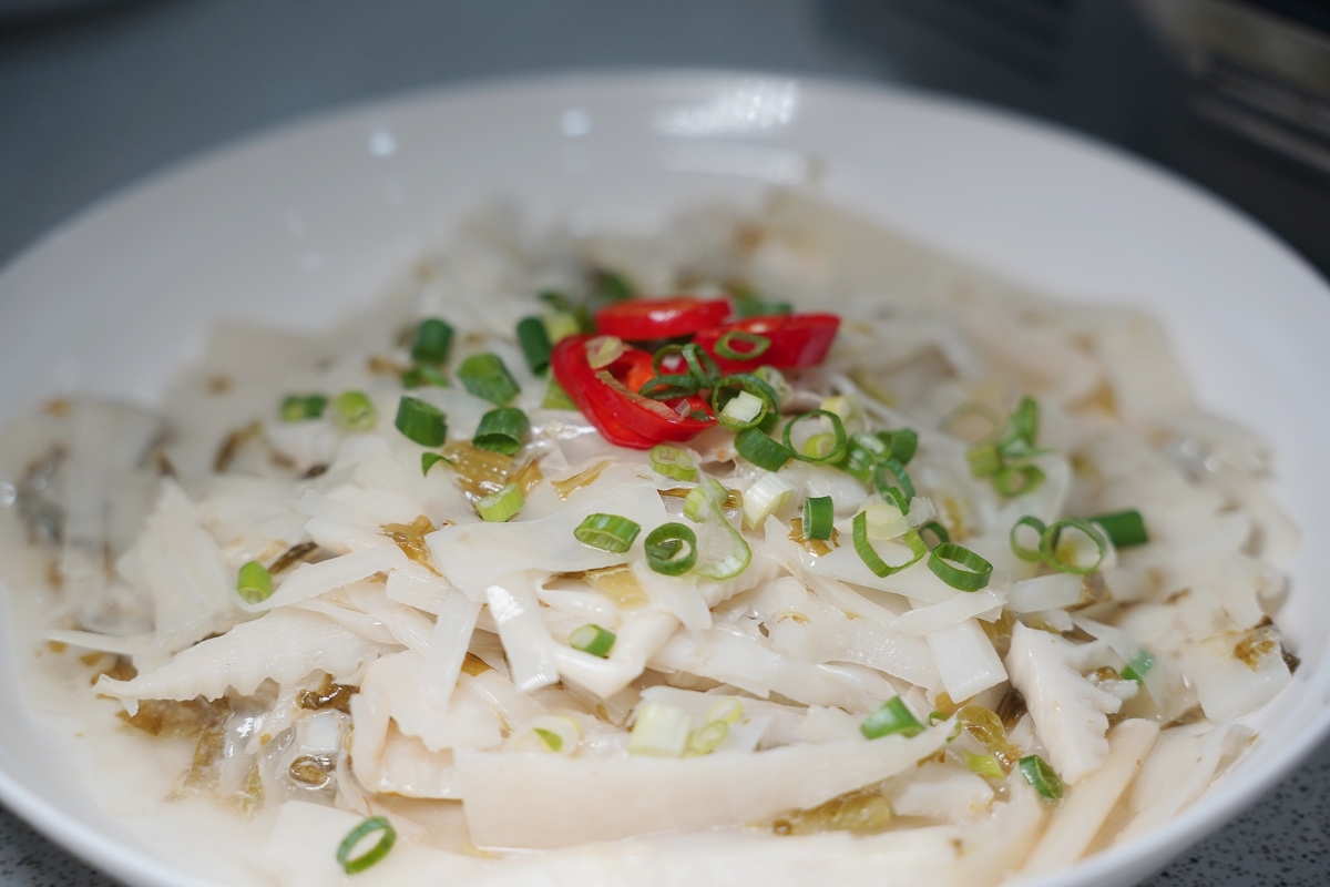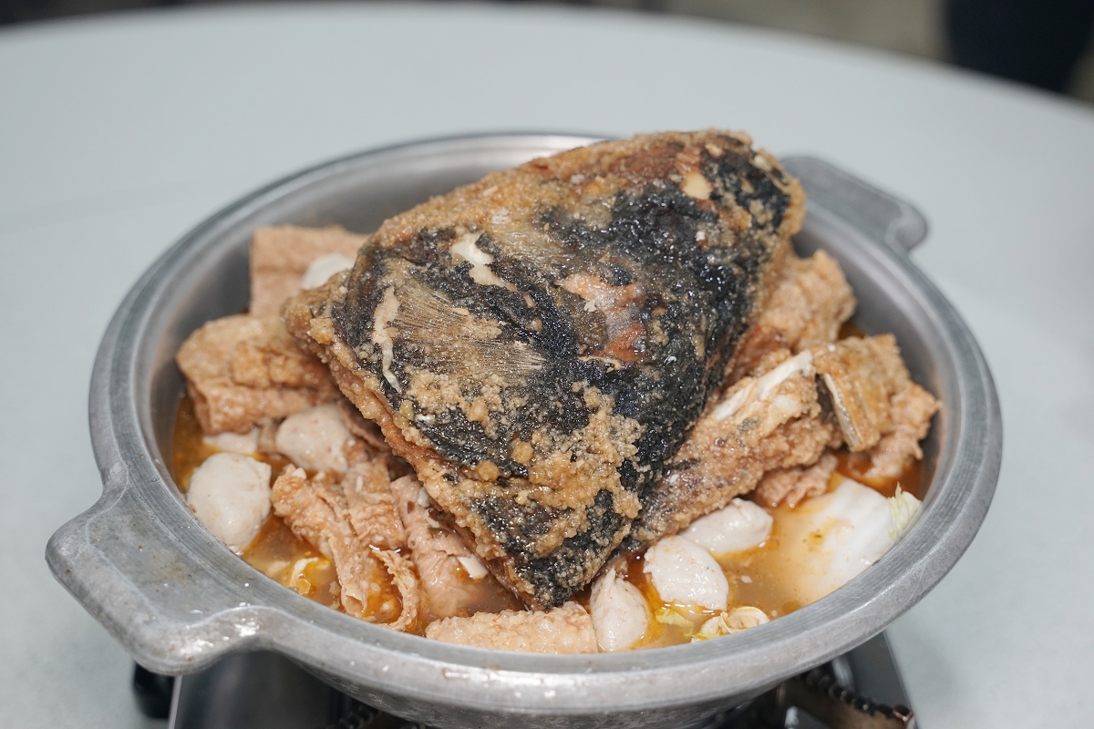 裡頭有魚頭半顆、魚肉、大白菜、魚丸、豆皮、豆腐和木耳,湯頭是濃郁的沙茶口味
