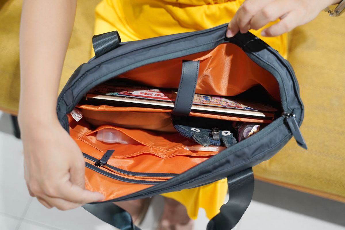 包包內可以看到有不少分類隔層與專屬筆電隔層,筆電隔層會有磁釦來穩固筆電