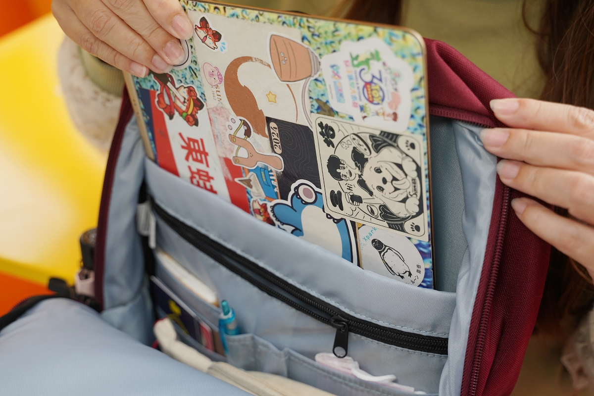 較常拿出來使用的物品我習慣放在外層,像現在還很熱我就會隨身攜帶手持電風扇&毛巾,這層其實是筆記型電腦快取層,中間還有筆袋設計讓商務人士方便拿取
