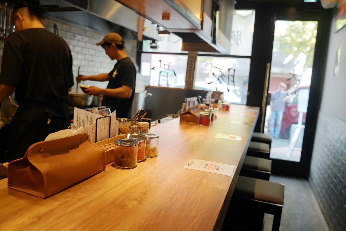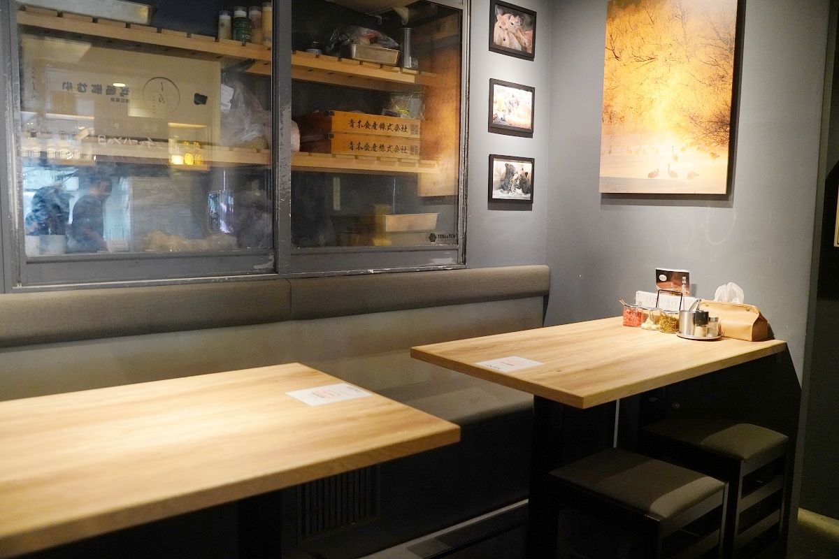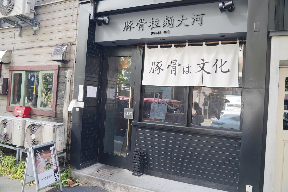 豚骨拉麵大河的位置就在北海道札幌狸小路商店街內、6丁目與7丁目中間的「西7丁目通」上,店面裝潢以純黑元素為主