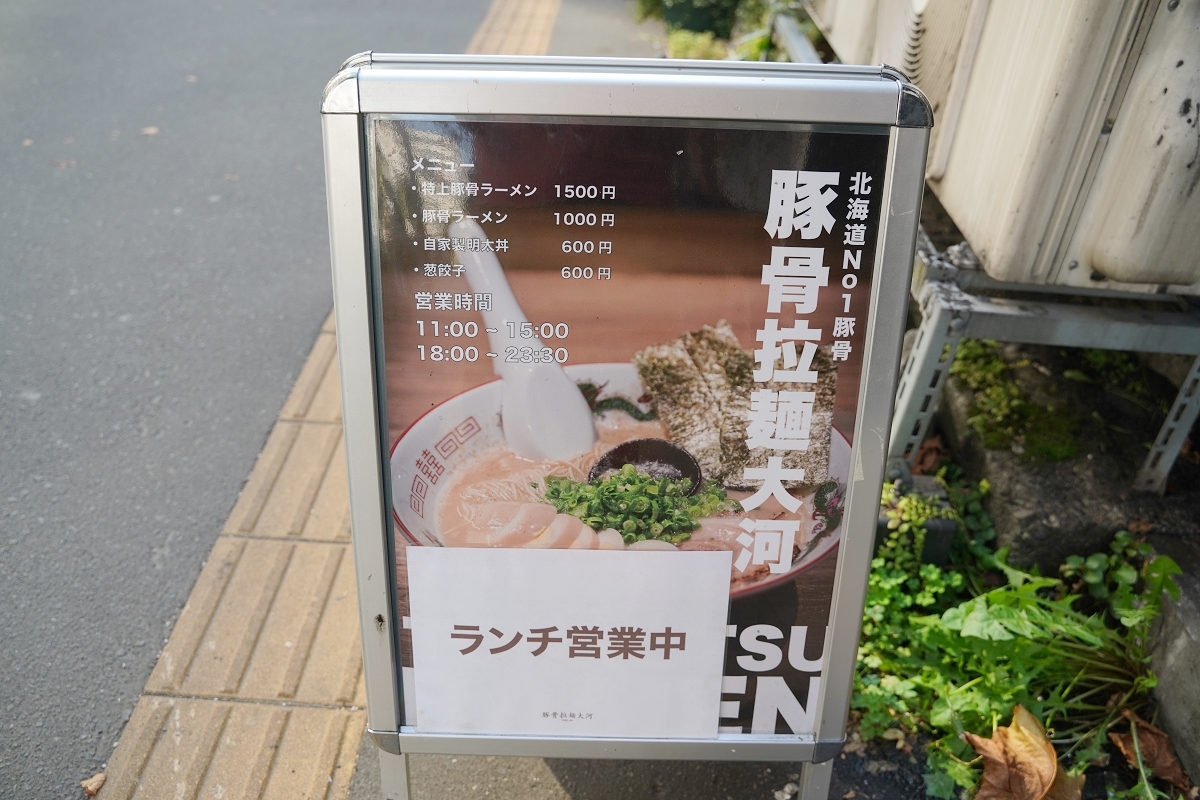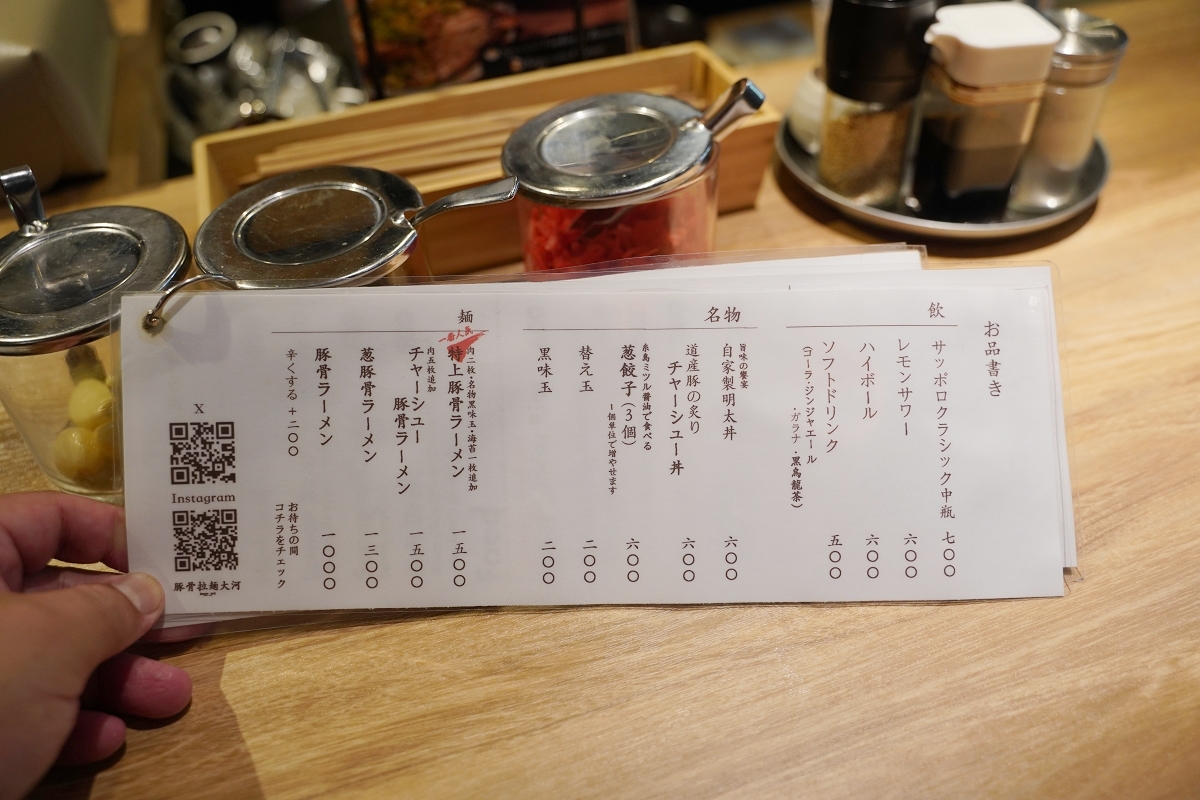 豚骨拉麵大河的餐點有拉麵、名物與飲品,拉麵有豚骨拉麵、蔥豚骨拉麵、叉燒豚骨拉麵以及特上豚骨拉麵,價格落在1000日圓到1500日圓之間,不定期還會推出限定口味的拉麵