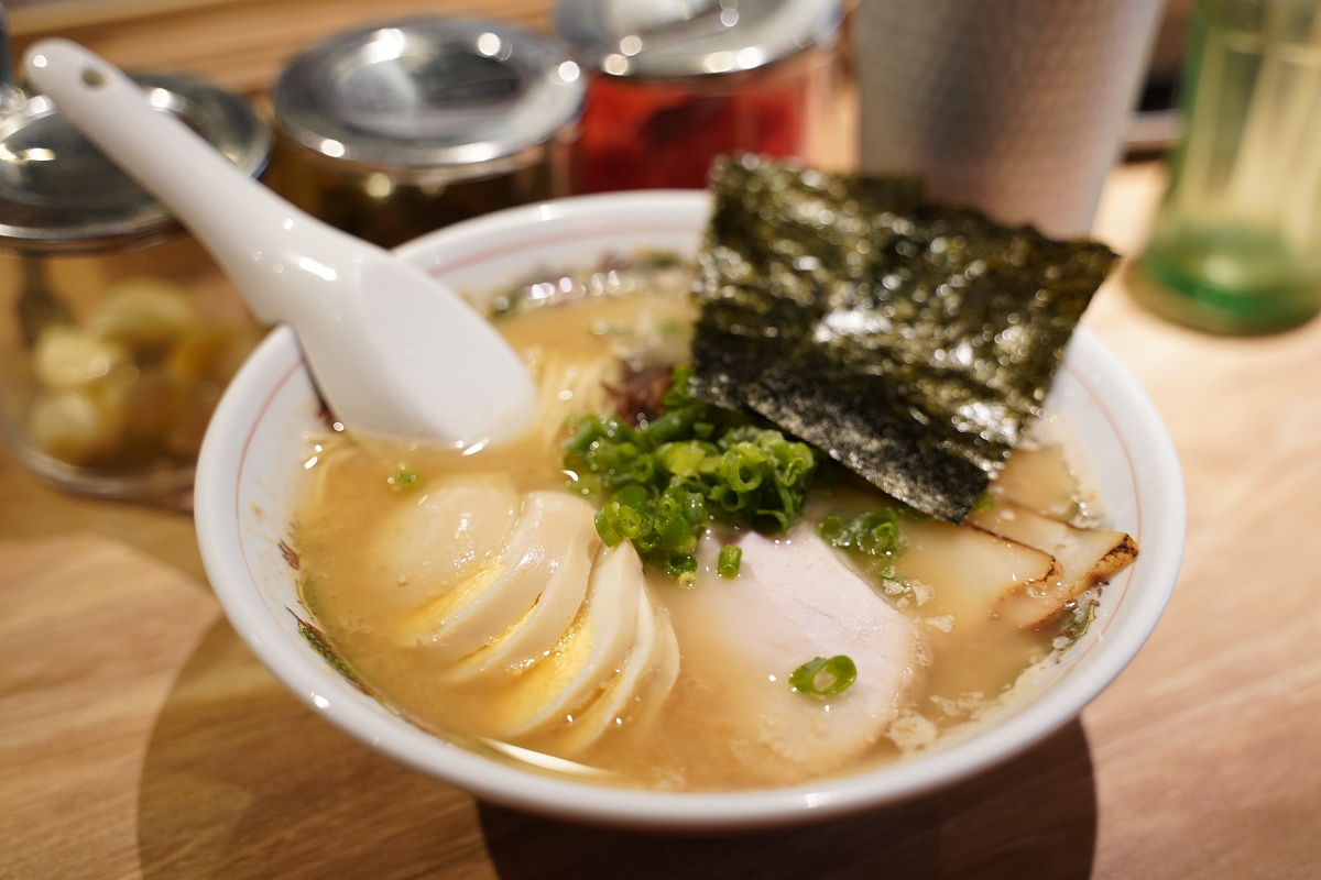 這碗就是我們當天點的特上豚骨拉麵,裡面有滷蛋、雞肉叉燒、豬肉叉燒與海苔,用料還滿豐富的