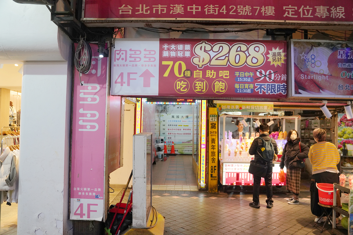 肉多多火鍋台北西門店的位置就在台北西門町商圈內的漢中街上,旁邊就是UNIQLO西門店,走樓梯上四樓就可以到達肉肉多西門店,如果要坐電梯的話,要再往前走一小段路就會看到電梯的出入口了