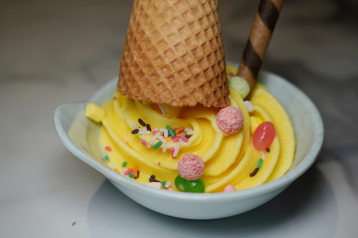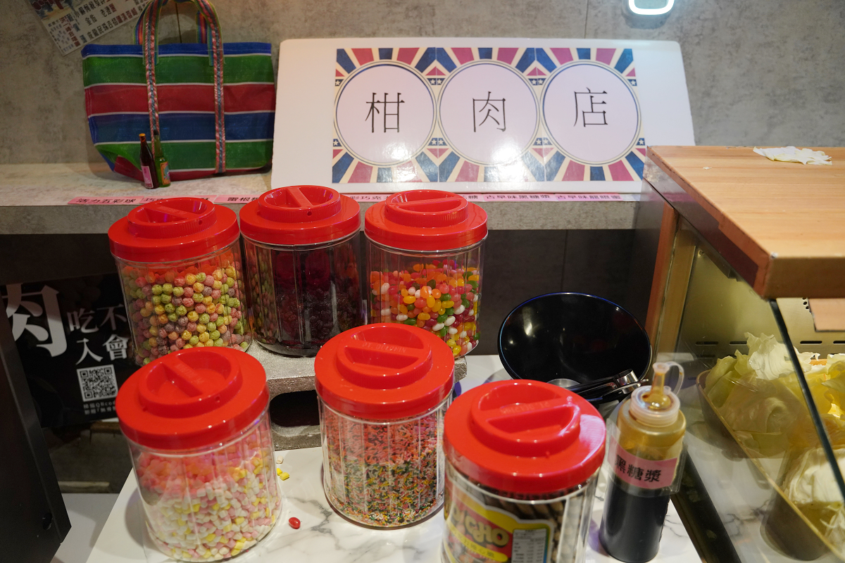 擠好霜淇淋後,還可以搭配一旁的五彩巧克力米、雷根糖、巧克力脆迪酥、五彩球與寒天水晶球等配料,做出屬於自己的繽紛聖代
