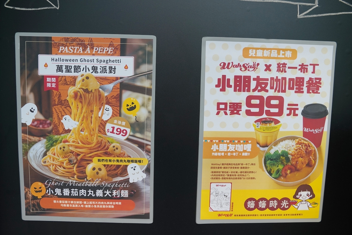 這間位於台北內湖港墘路上的「WahSay! 內科港墘店」是不少內科上班族午餐的愛店之一,WahSay! 內科港墘店裡擁有兩個餐飲品牌:「佩佩奶奶大份量義大利麵」以及「東大關日式咖哩飯」,當天我們點了萬聖節限定「小鬼蕃茄肉丸義大利麵」以及兒童餐新品「小朋友咖哩餐」,小鬼蕃茄肉丸義大利麵可以看到用起司片和肉丸做成的黃色幽靈,不吃義大利麵的也有小鬼肉丸咖哩飯可以選,而小朋友咖哩餐可以一次吃到炸雞咖哩、統一布丁以及蘋果汁,通通都是小朋友的最愛唷!!