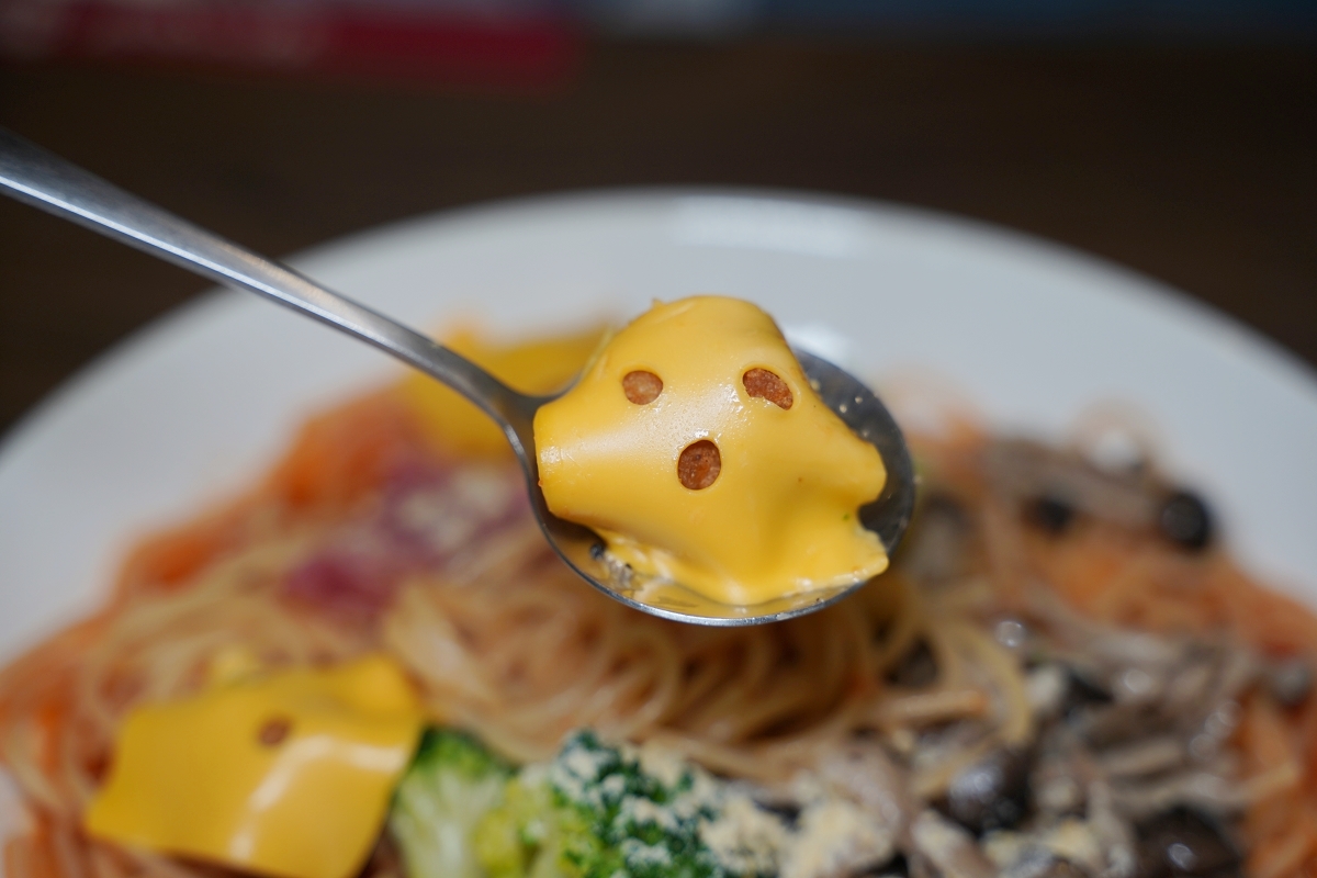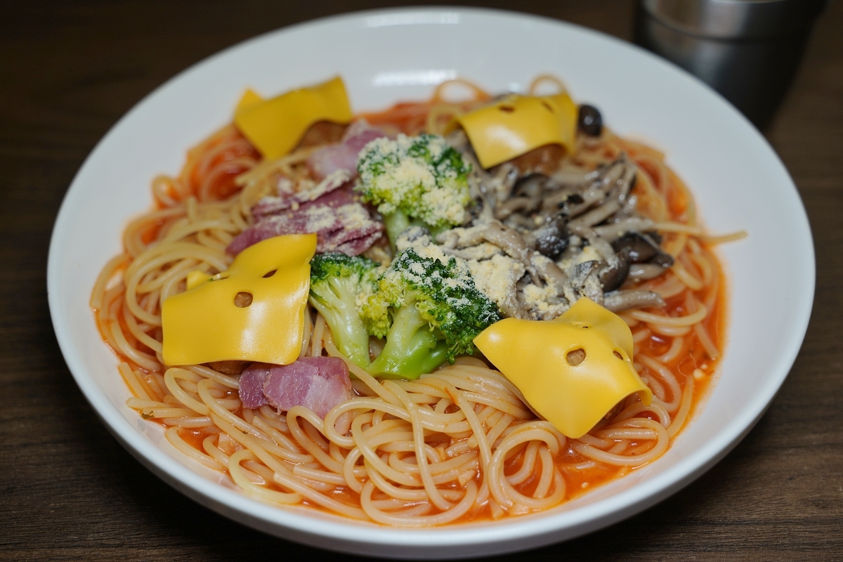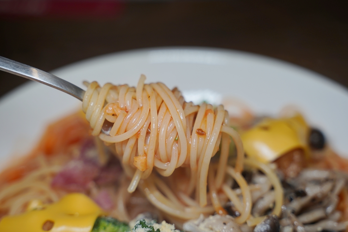 小鬼蕃茄肉丸義大利麵除了舖上起司片的肉丸之外,其他還有花椰菜、火腿以及滿滿的菇類,算是用料豐富