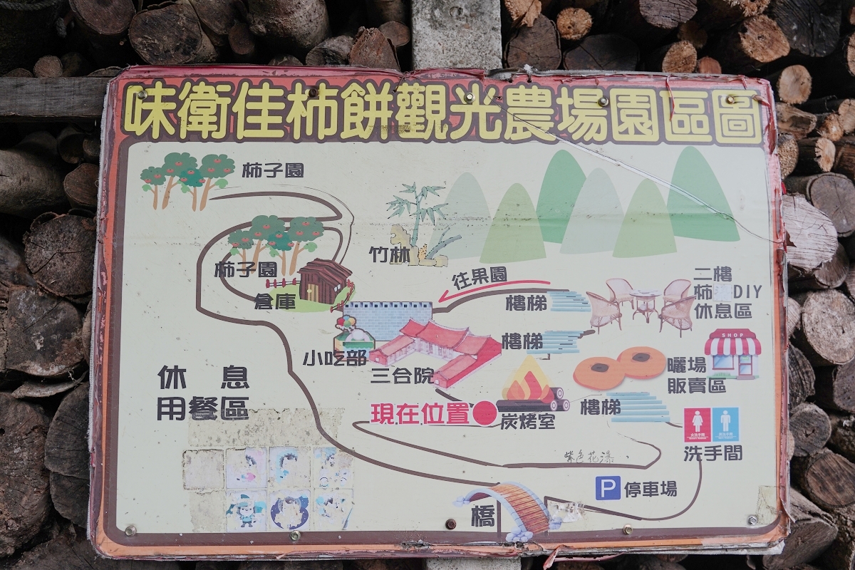味衛佳柿餅教育農園裡有柿子園、小吃部、三合院、炭烤室、曬場和販賣區,全園不需門票免費入園,真的太佛心了