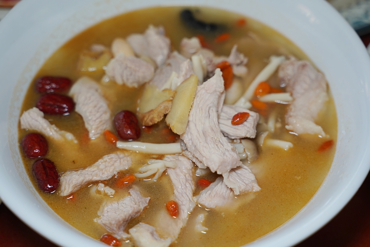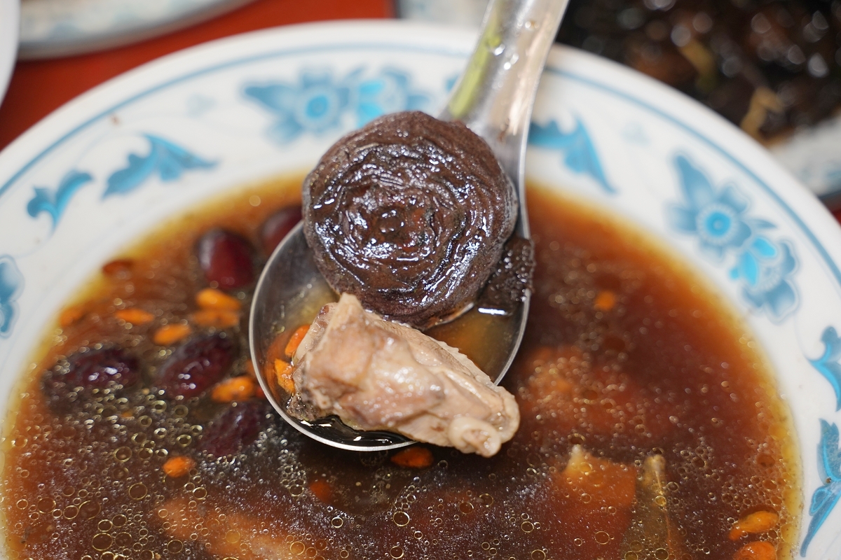 柿餅雞湯,第一次喝到加入柿餅的雞湯,雞湯以四物中藥調味,味道非常的鮮甜,柿餅口感軟爛,推薦必點