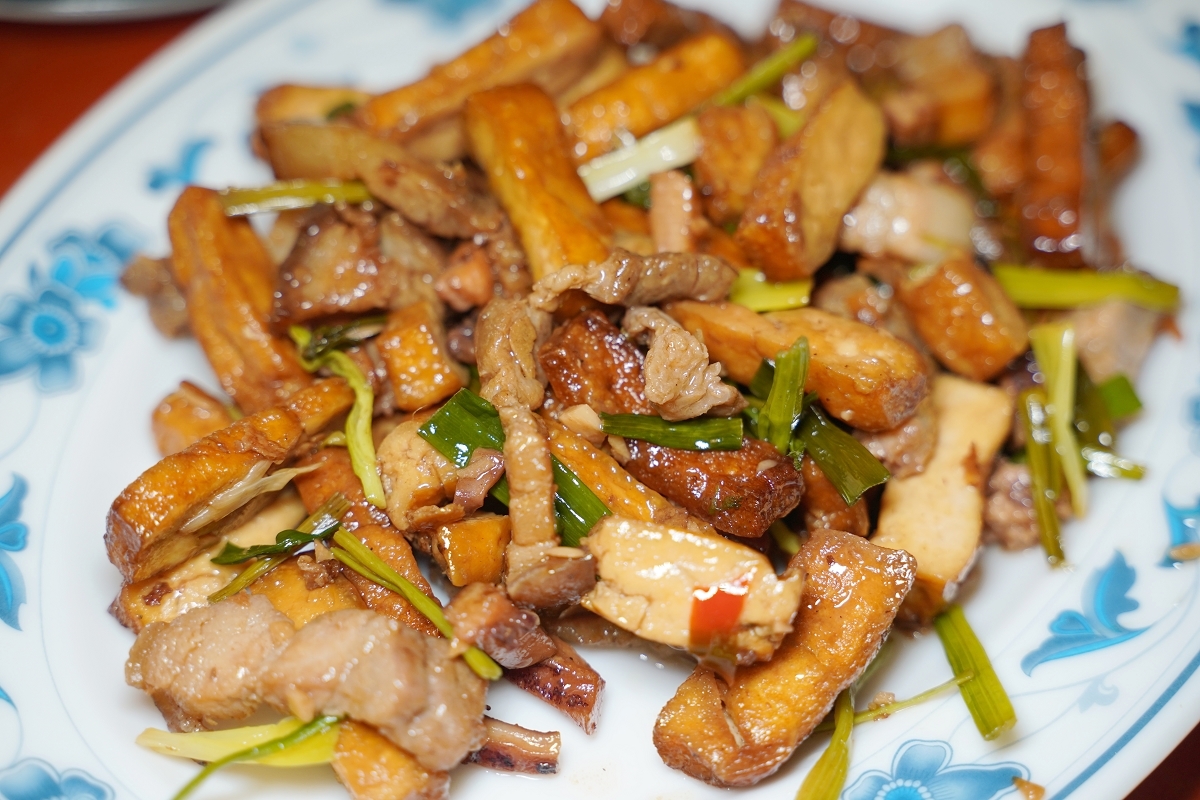 客家小炒,肉絲和豆干有嚼勁,香氣四溢
