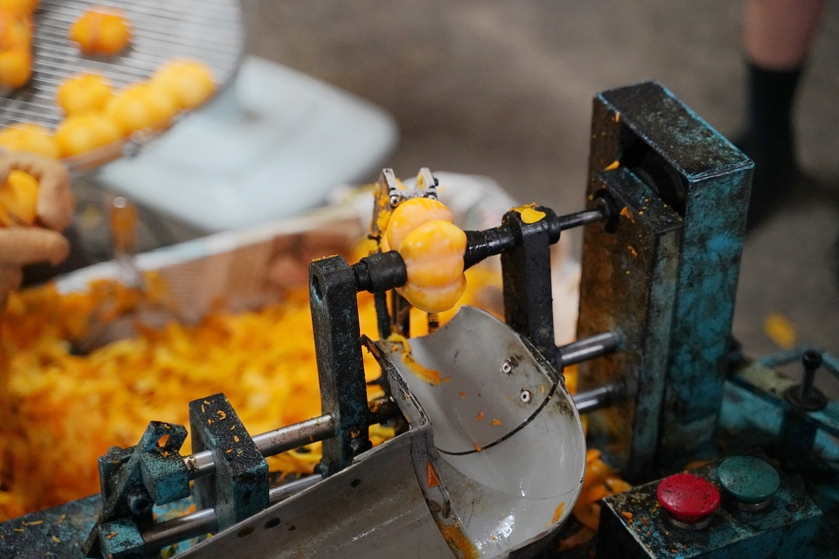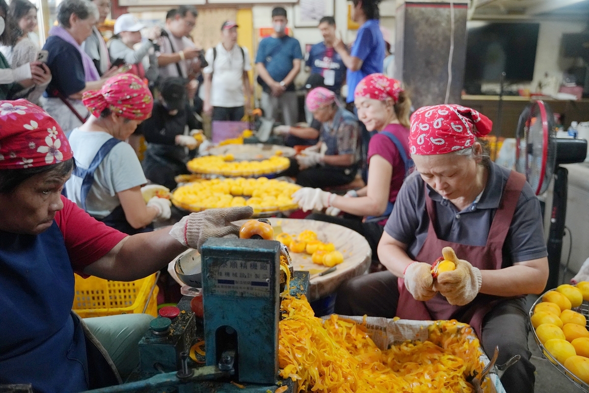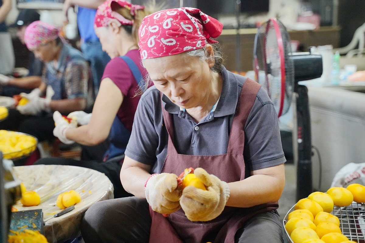 接著我們來到味衛佳柿餅教育農園的去萼削皮間,可以看到婆婆媽媽們正忙著幫新鮮柿子削皮