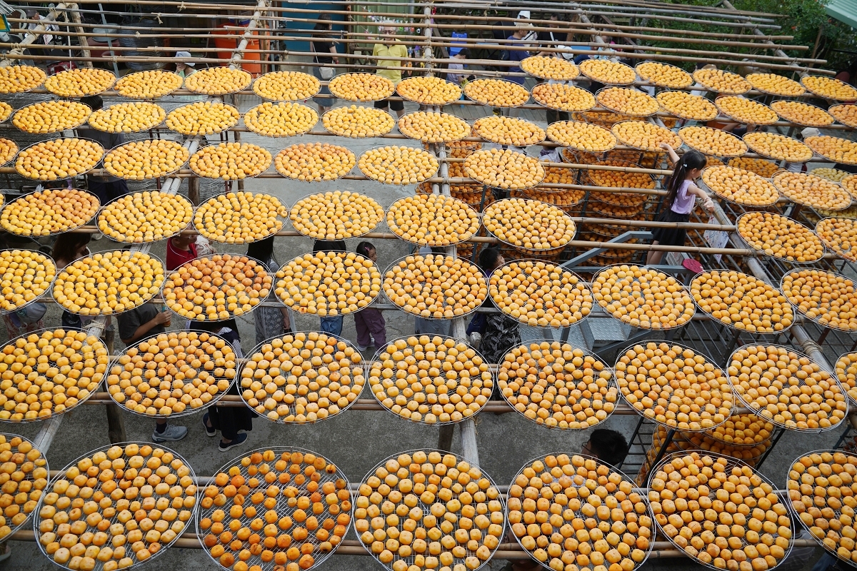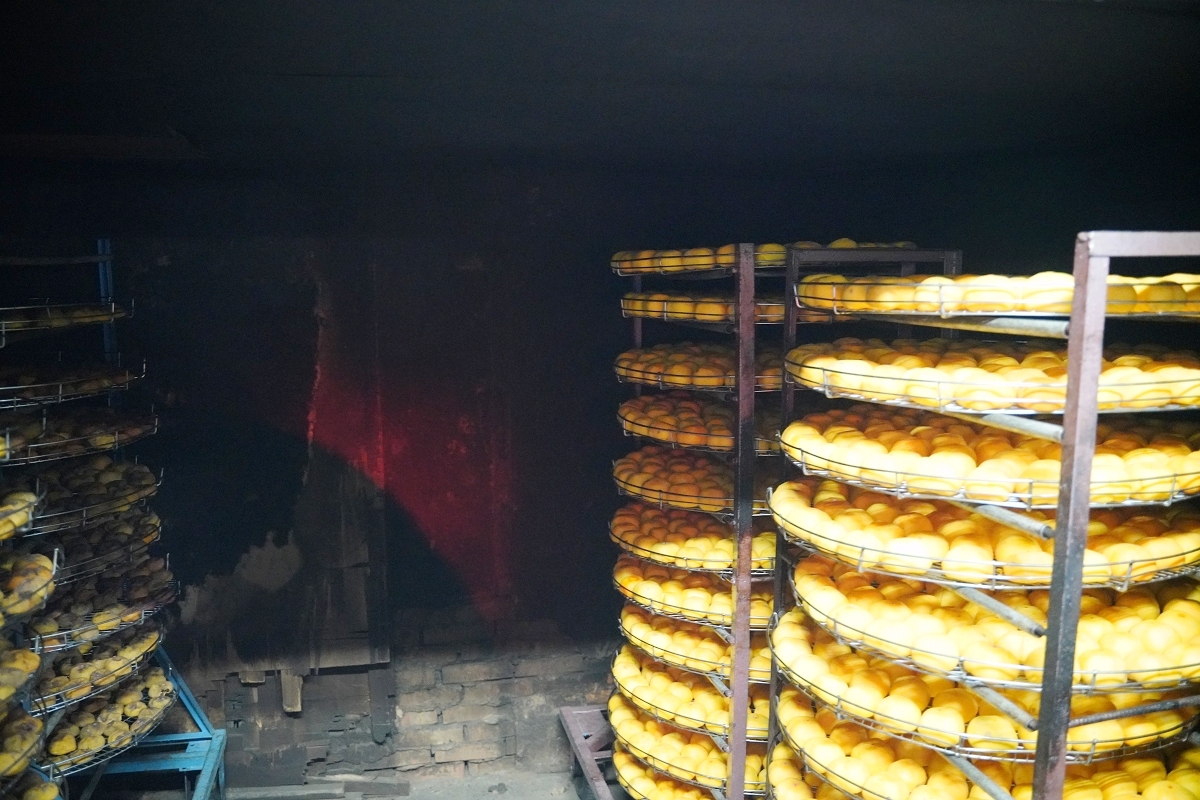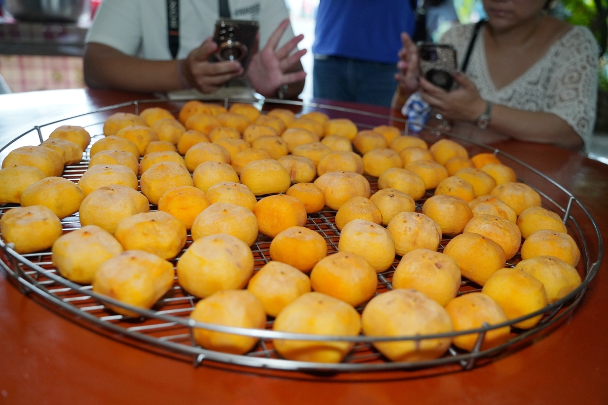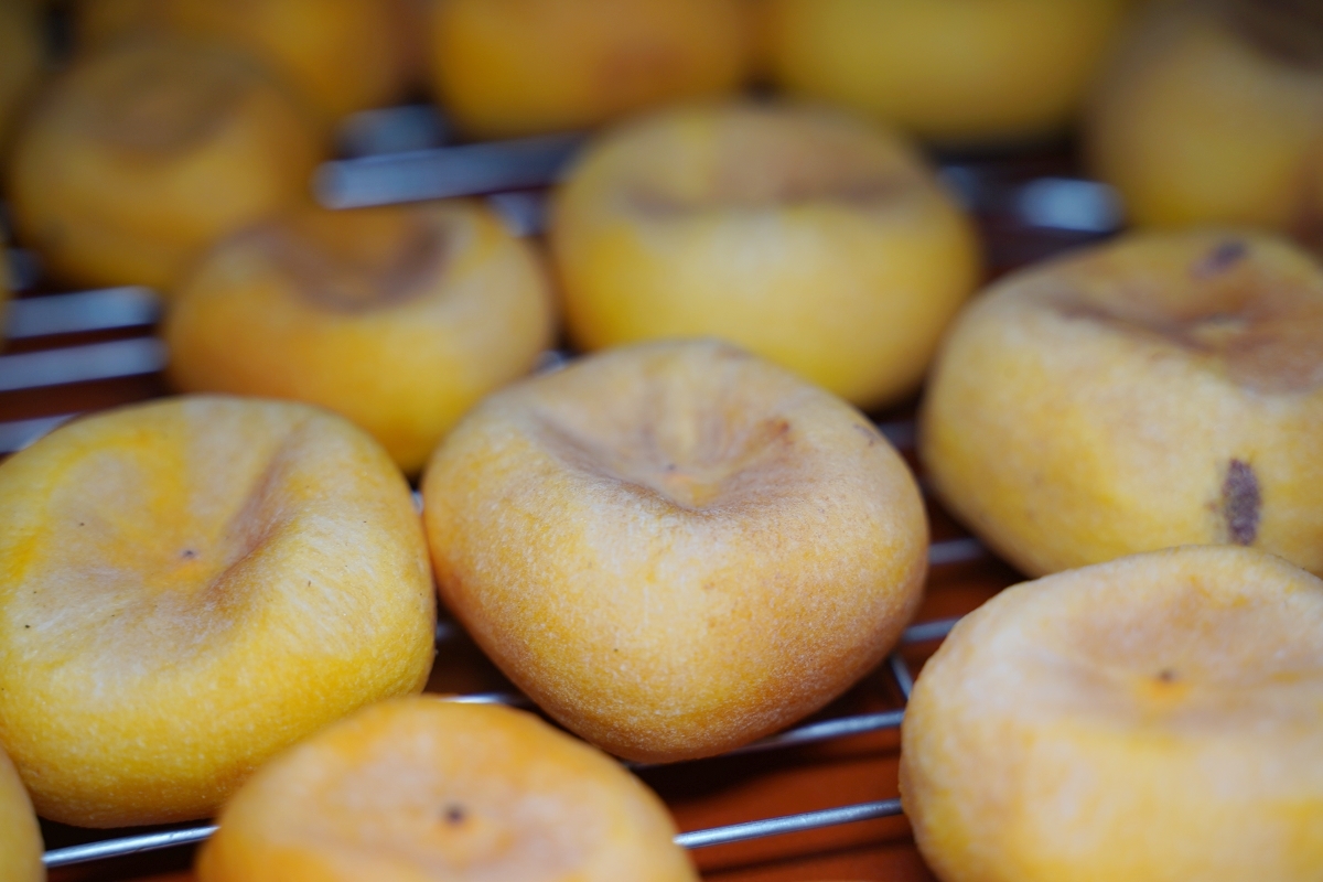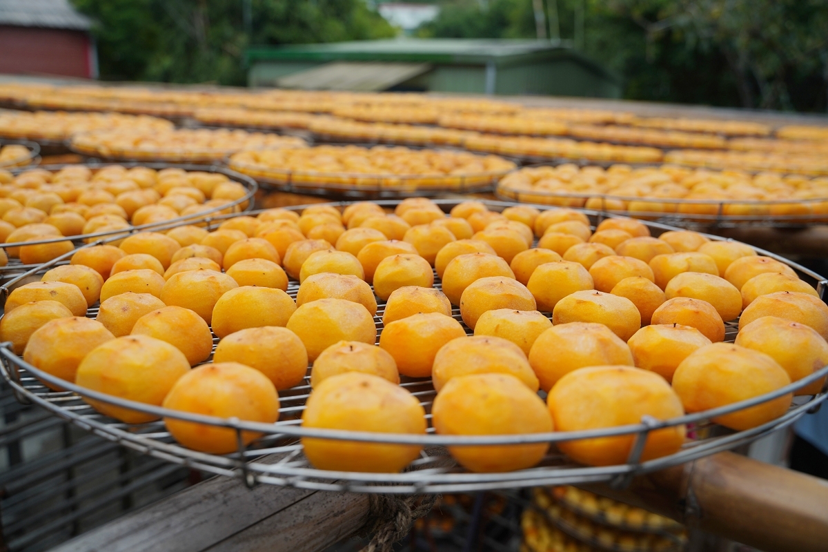 烘烤完畢後,柿子就會被送來日曬場,室外日曬天數依品種不同約7~9日不等,並在第4天後每天人工捏柿子,為的就是要增加甜度