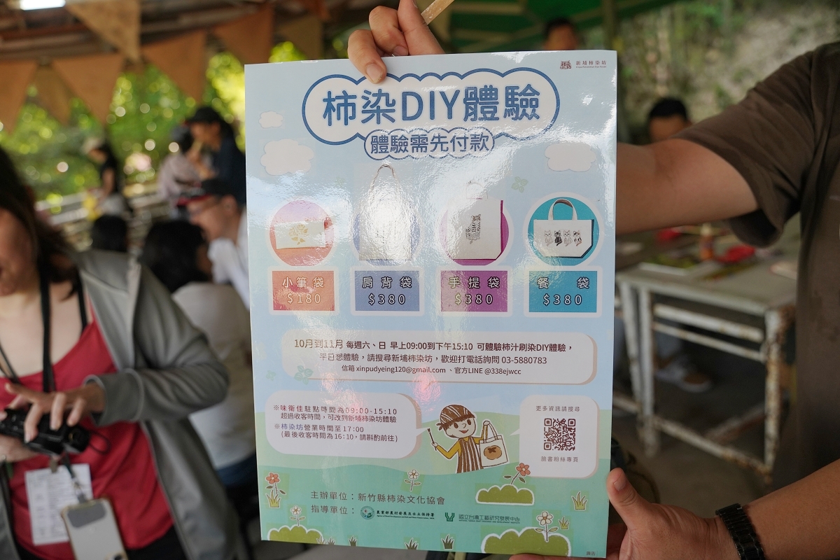 99年正式成立新竹縣柿染文化協會,致力發展與推動柿染技藝,柿染的汁液取自削下來的柿皮萃取成汁,或是拿未熟的柿果榨汁後存放發酵,由於柿子富含單寧酸與膠質,因此染色後的布料具有防潑水且耐洗耐曬的特色