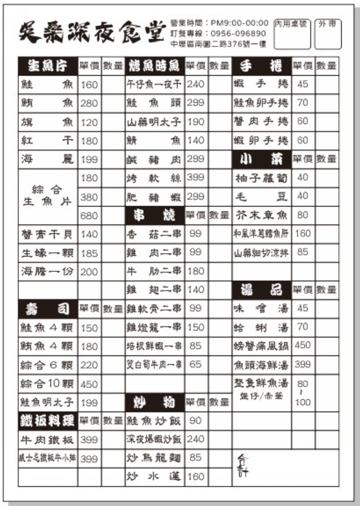 吳桑深夜食堂的餐點以日式料理為主,有生魚片、壽司、鐵板料理、烤魚時魚、串燒、炒物、手捲、小菜和湯品,餐點種類豐富