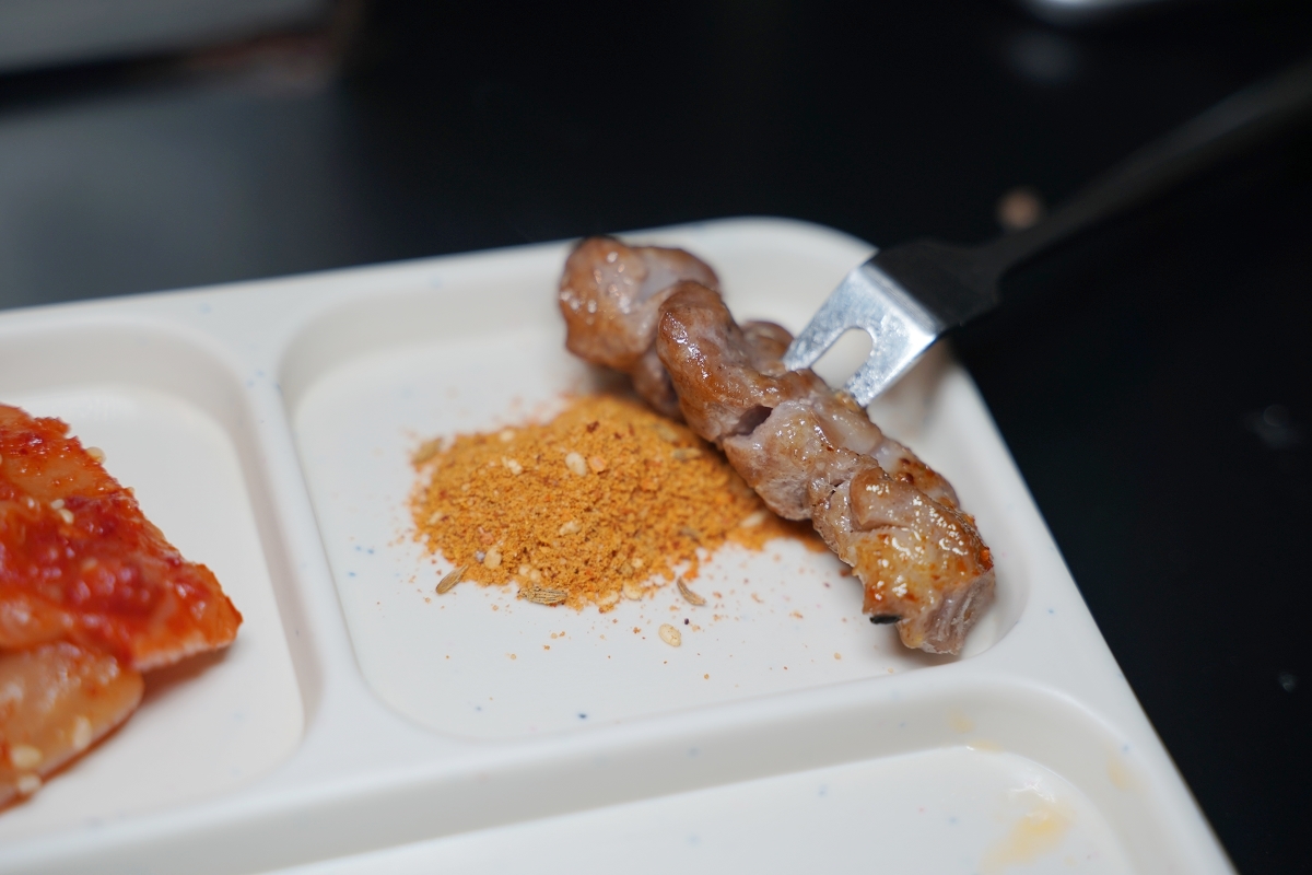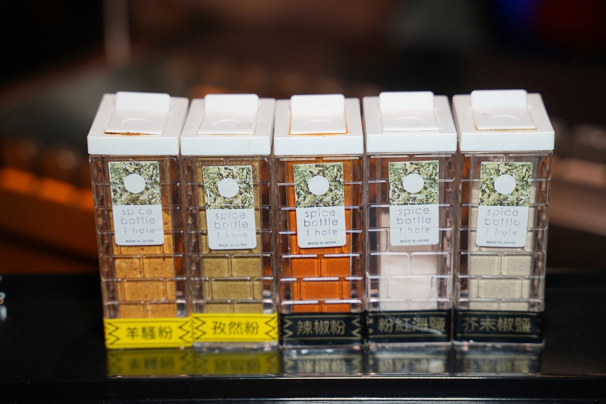 桌上有各種調味料,像是有芥末椒鹽、羊騷粉、孜然粉、辣椒粉和粉紅海鹽,其中羊騷粉是店家的獨家配方,但肉類串燒其實直接吃就滿好吃的,沾點各種調味粉也有不同風味