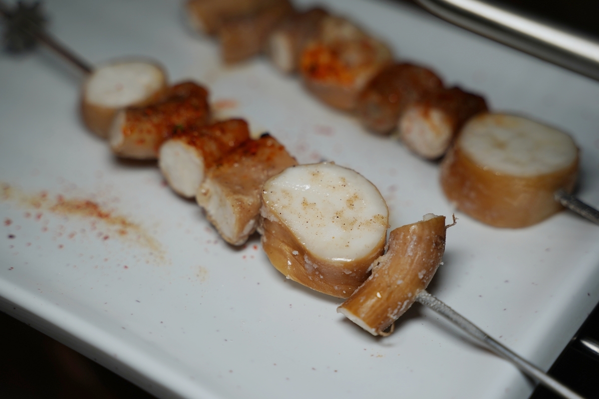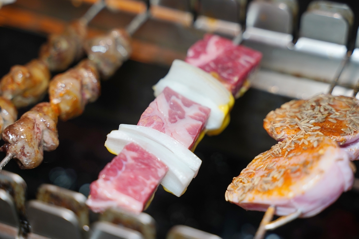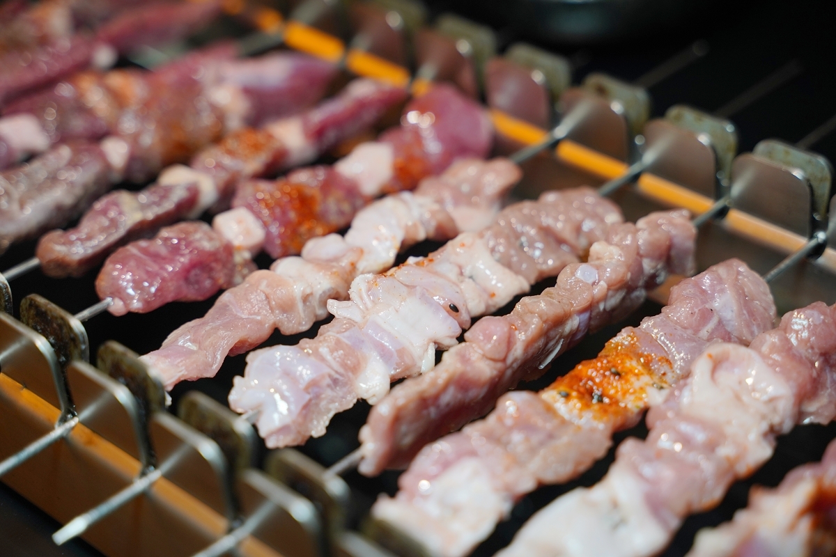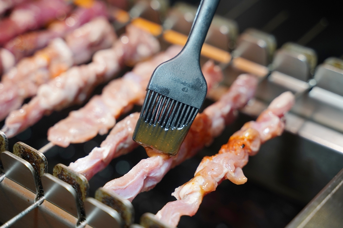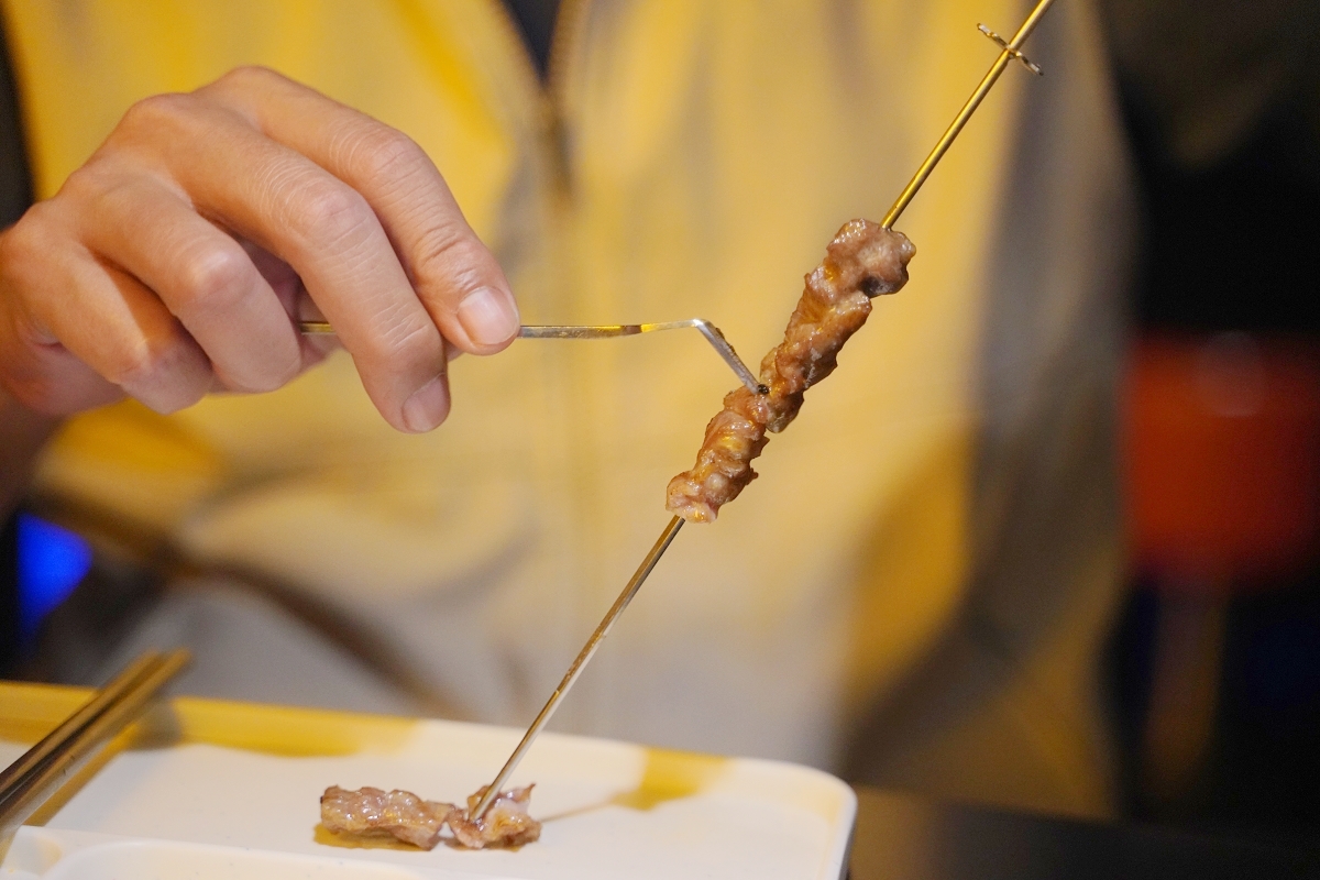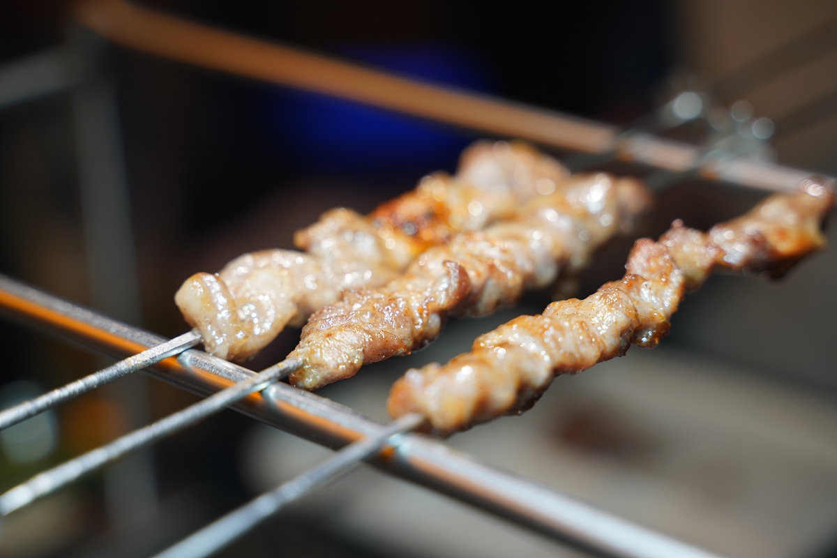 來羊騷殿要燒烤串燒真的超簡單,只要把串燒一串一串擺好就可以自動燒烤了,烤爐兩旁都會有鍊條滾動,每一根串燒上頭也會有可以卡住鍊條的齒輪,只要把這個齒輪卡在鍊條上就行了,自動燒烤完全不用擔心會烤焦烤過頭,而且還會把多餘的油脂烤出來