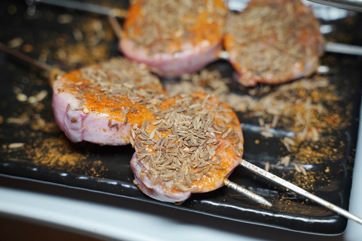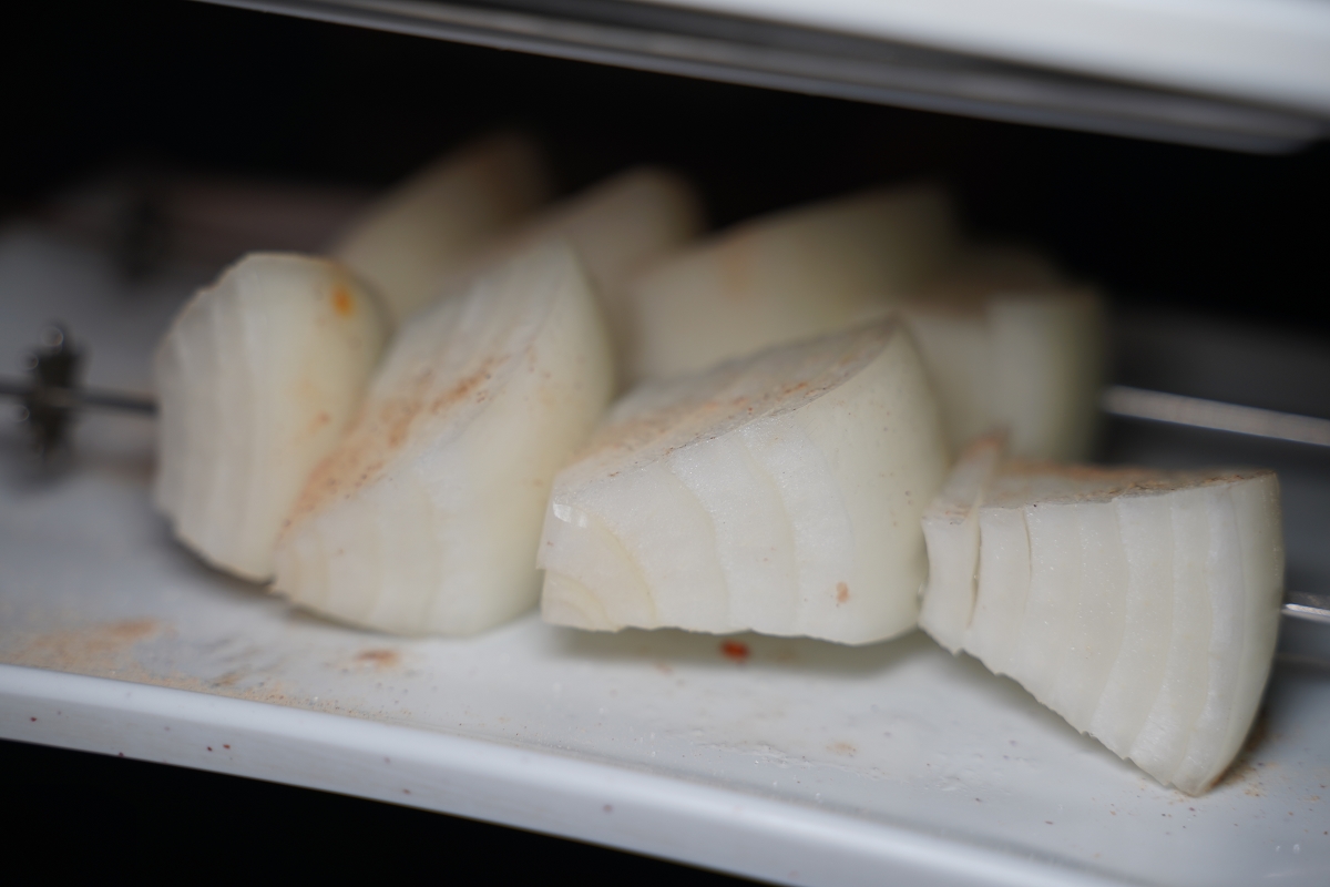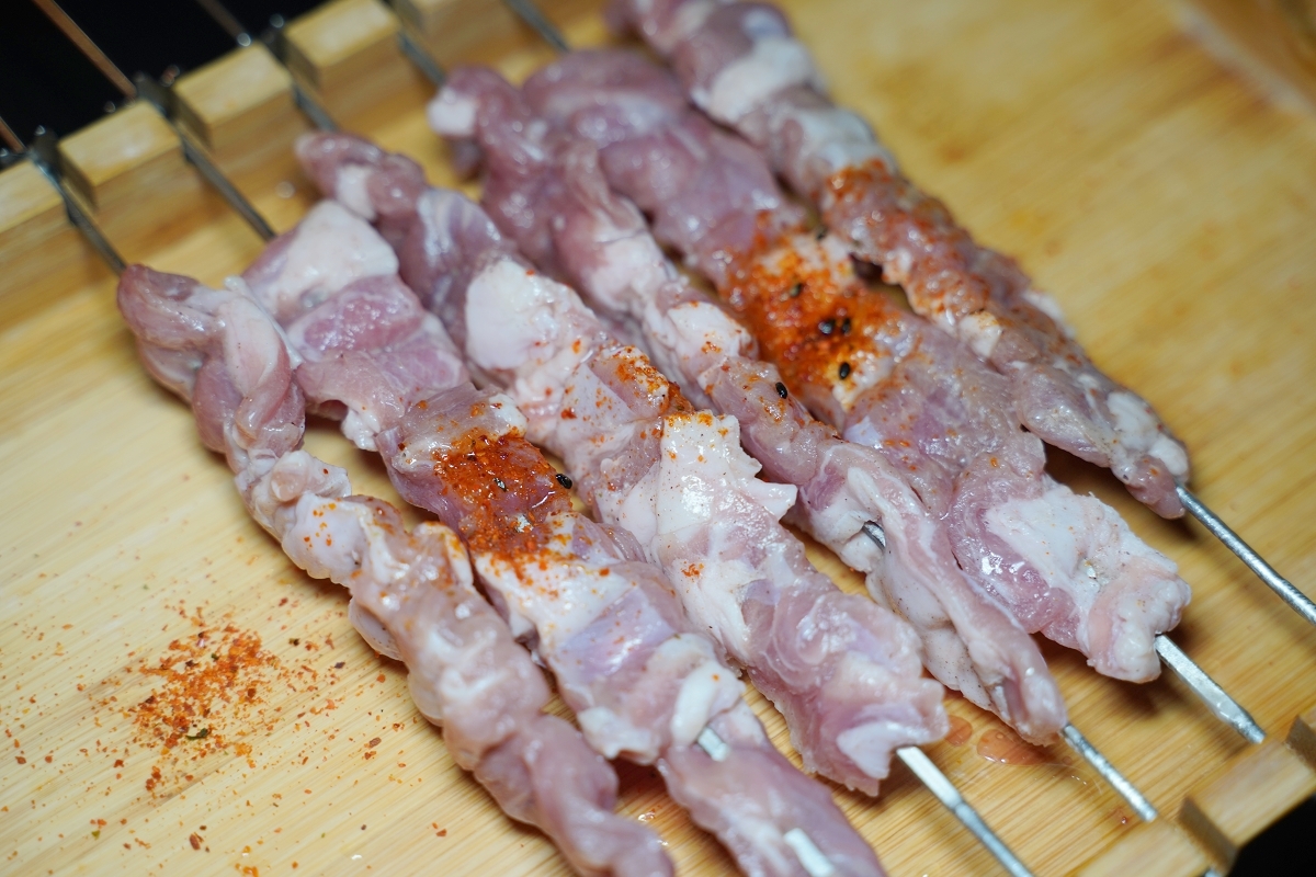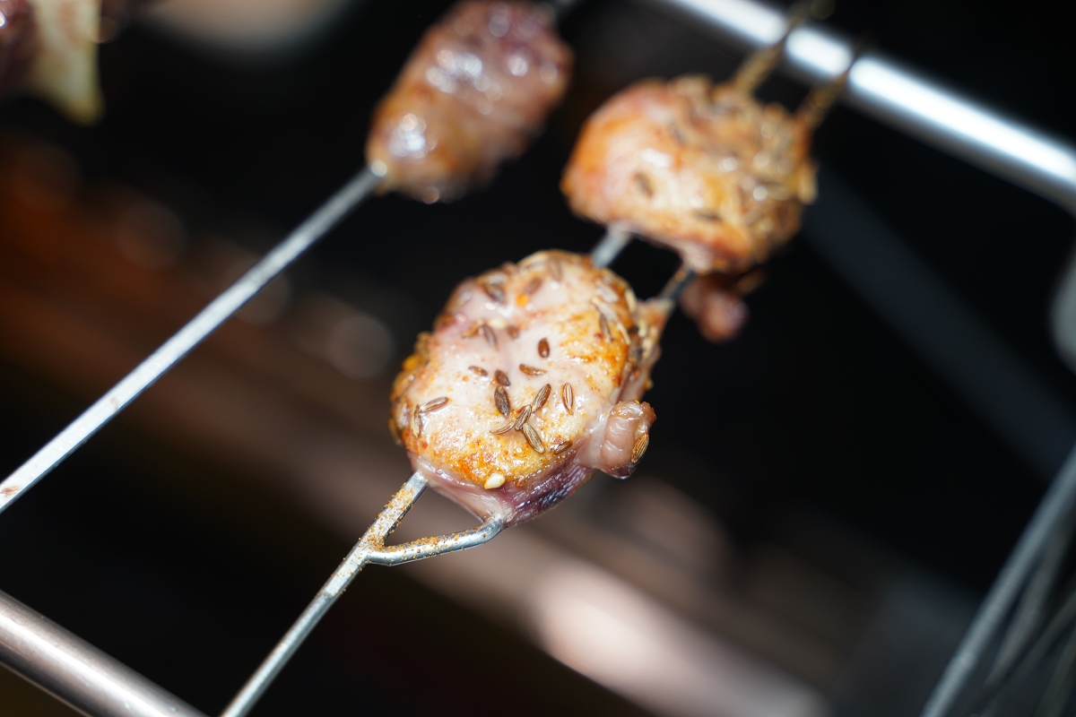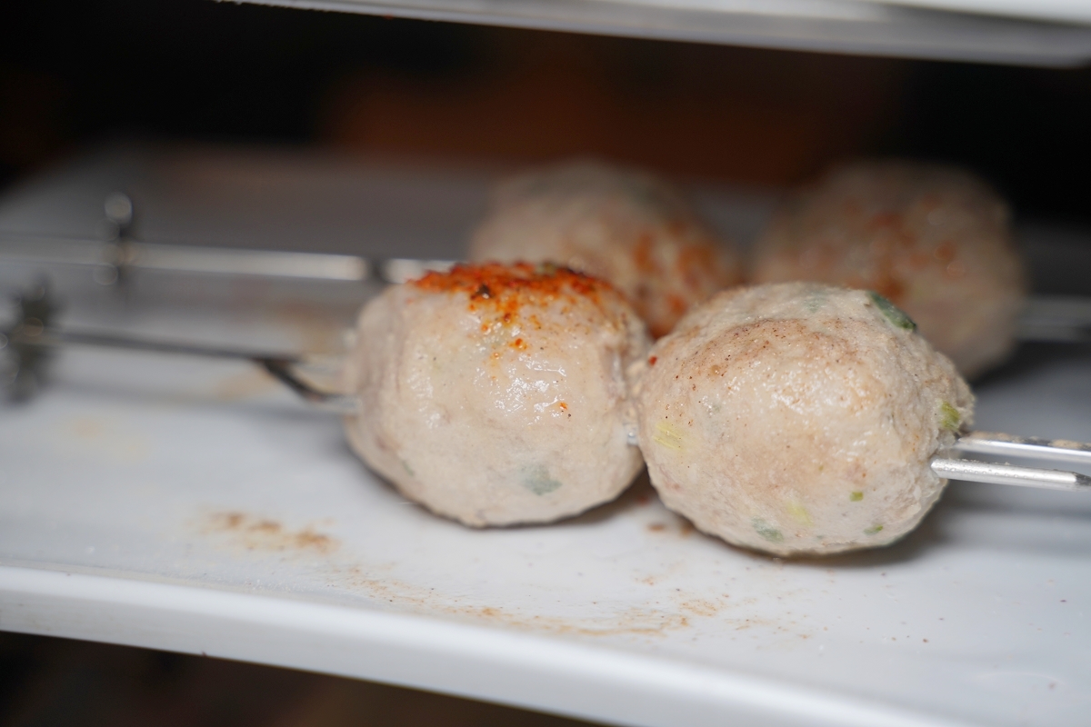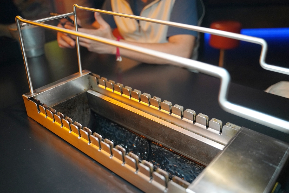 來羊騷殿要燒烤串燒真的超簡單,只要把串燒一串一串擺好就可以自動燒烤了,烤爐兩旁都會有鍊條滾動,每一根串燒上頭也會有可以卡住鍊條的齒輪,只要把這個齒輪卡在鍊條上就行了,自動燒烤完全不用擔心會烤焦烤過頭,而且還會把多餘的油脂烤出來