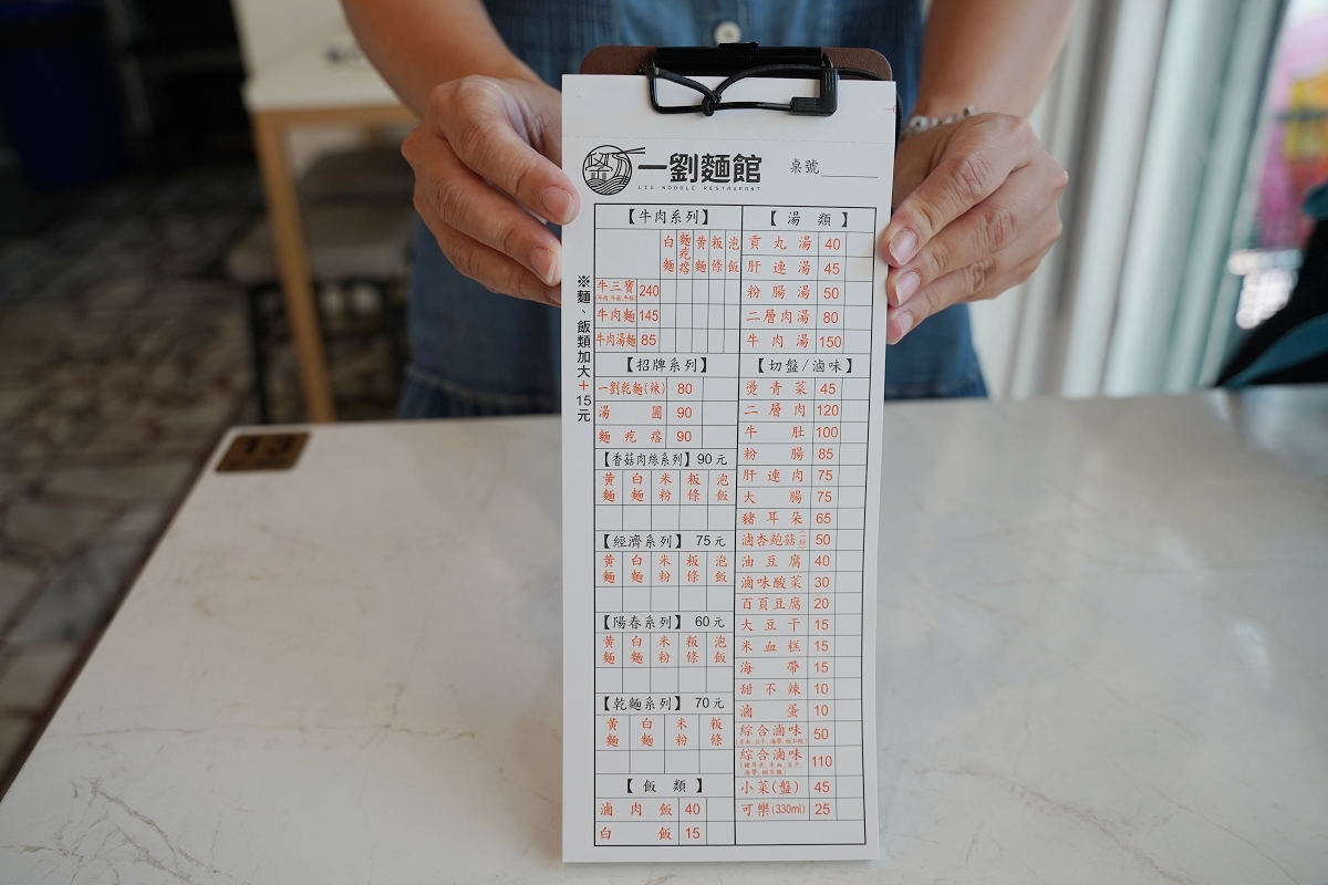 一劉麵館的餐點種類以麵食為主,有牛肉麵、乾麵、湯圓、香菇肉絲系列、陽春系列、滷肉飯、湯品以及各種小菜